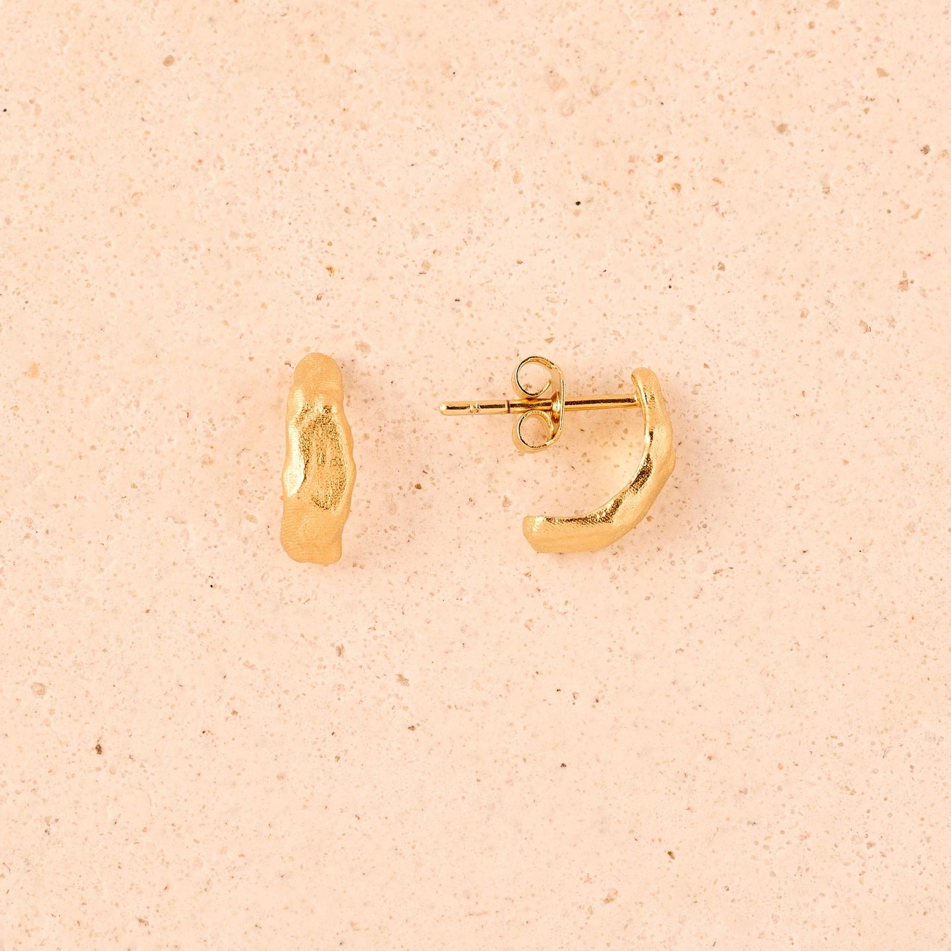 Indulge in effortless elegance with our Agapée Analia Earrings. These small half-hoop earrings feature a soft, irregular shape and a textured finish, perfect for stacking and creating a huggie effect. Ethically made in France, these gold-plated earrings add a sophisticated touch to any outfit.