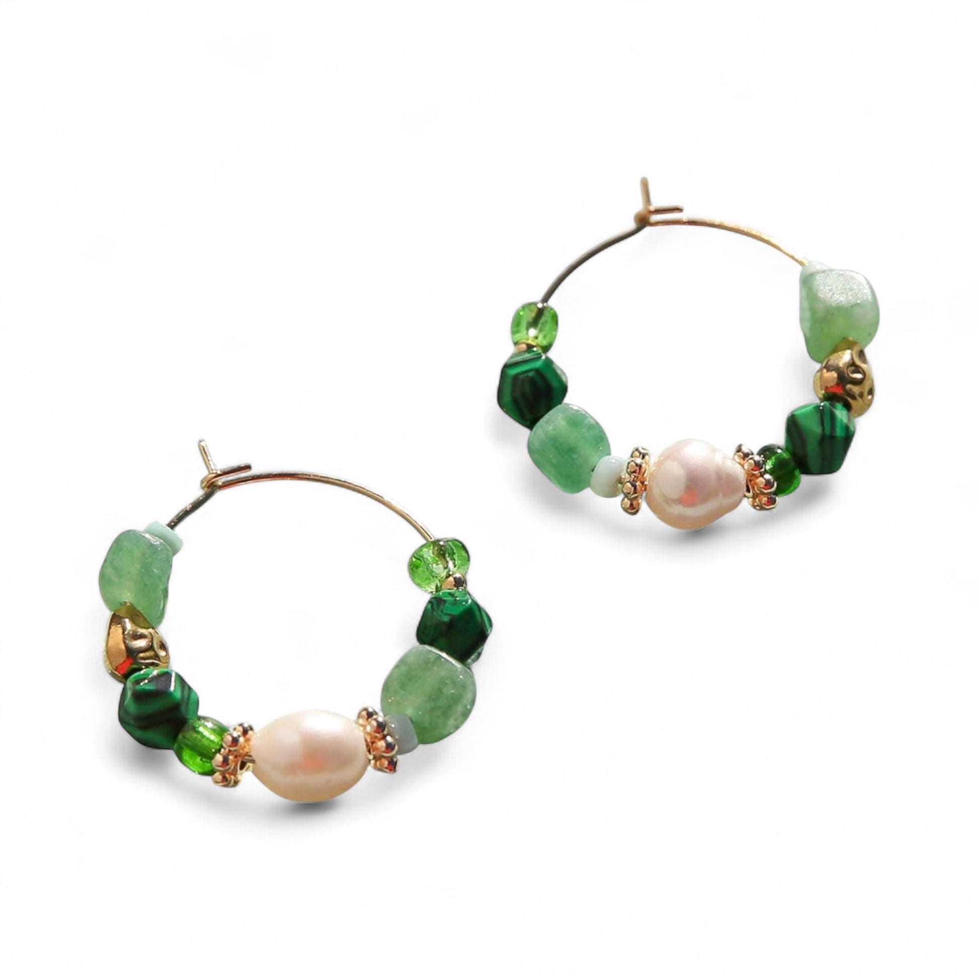 Handmade earrings on surgical steel hoops with fresh water pearls, quartz, Malachite & glass beads .
