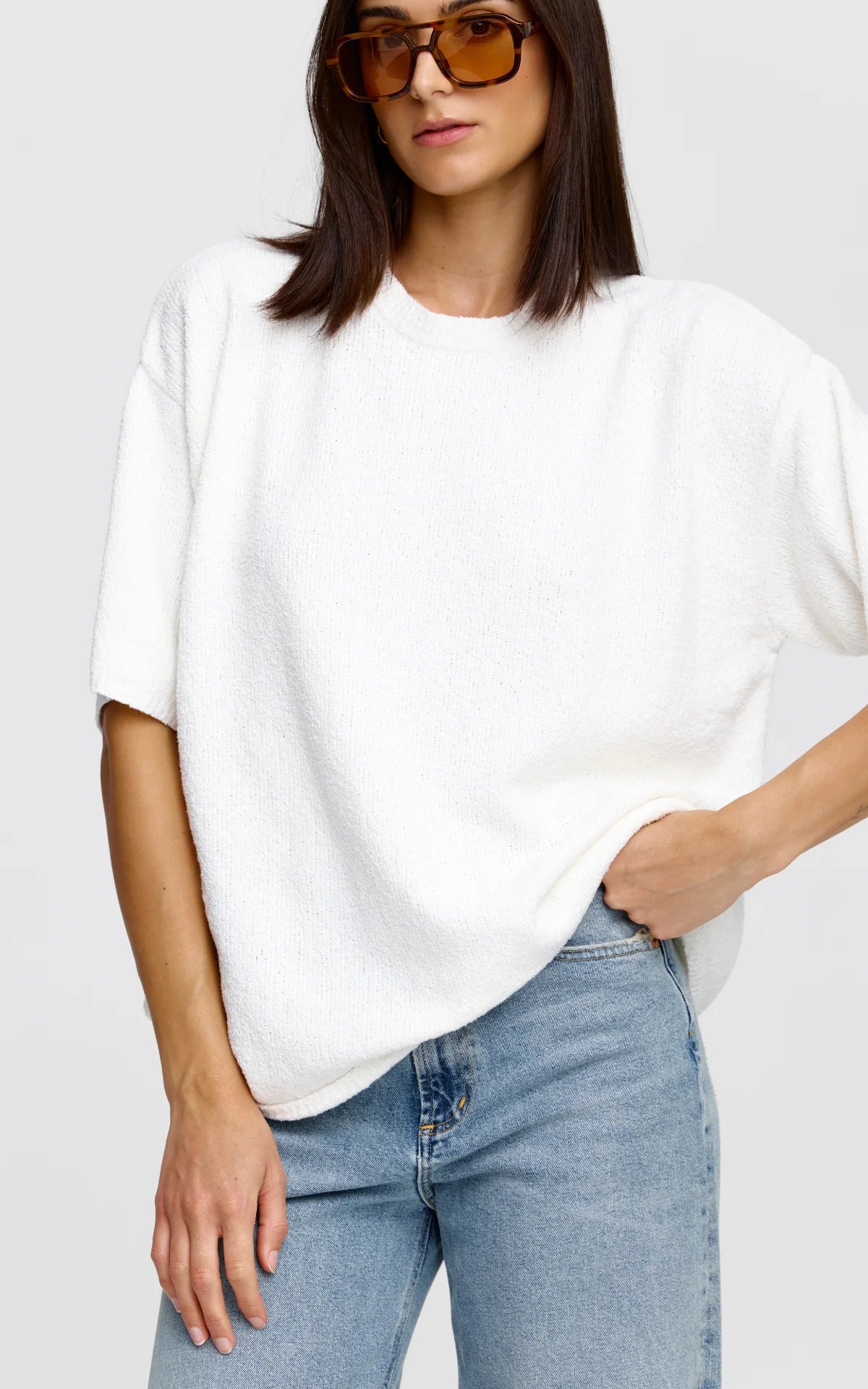 The Camden Knit Tee is a flattering oversized shape made in our luxe boucle knit fabric. This timeless staple can be paired with Denim to complete the look.
