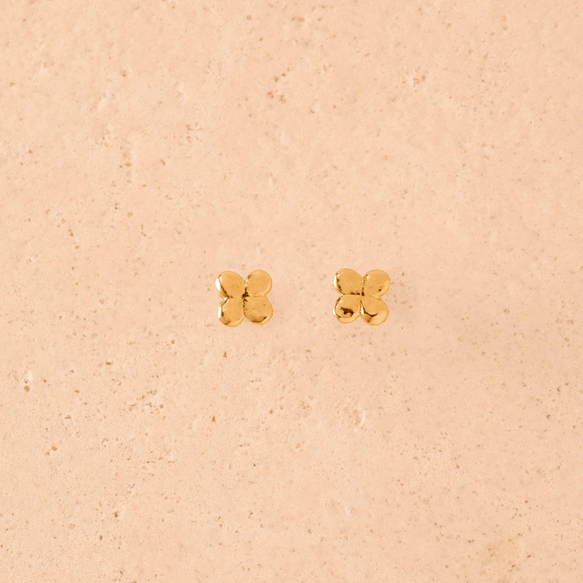 Indulge in the opulence of Agapée Laeta Stud Earrings. These ethically made, gold plated earrings feature a delicate four-leaf clover design, perfect for adding a touch of luck to any outfit. With a subtle irregular finish and a weight of only 0.3g, these earrings are a tasteful and elegant addition to your jewelry collection.